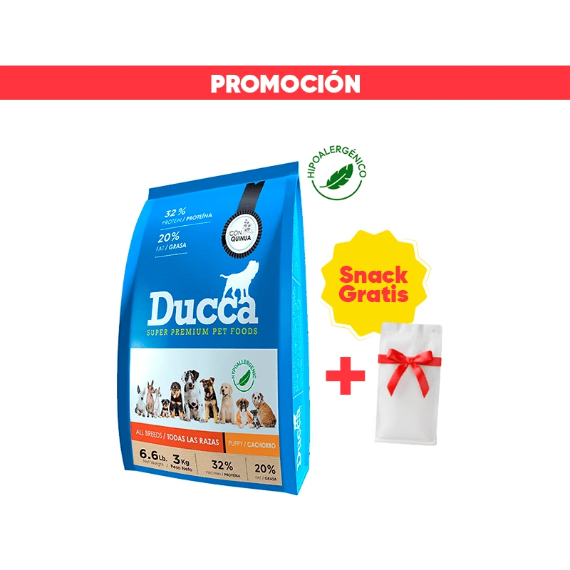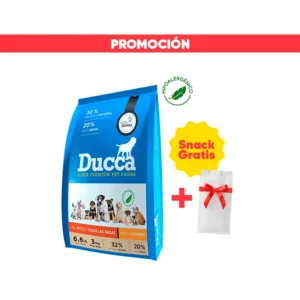 Ducca Cachorro es un alimento Super Premium para perros cachorros de todas las razas. También es ideal para hembras gestantes y para hembras que se encuentren en periodo de lactancia. Este alimento para perros cachorros está elaborado con ingredientes de alta calidad y con una tecnología de extrusión de última generación. Por otro lado, esta comida para perros cachorros fue probada y validada cumpliendo las recomendaciones de la AAFCO. Además, presenta un excelente balance entre sus macro y micro nutrientes los cuales contribuyen a la óptima salud del perro.