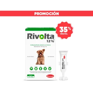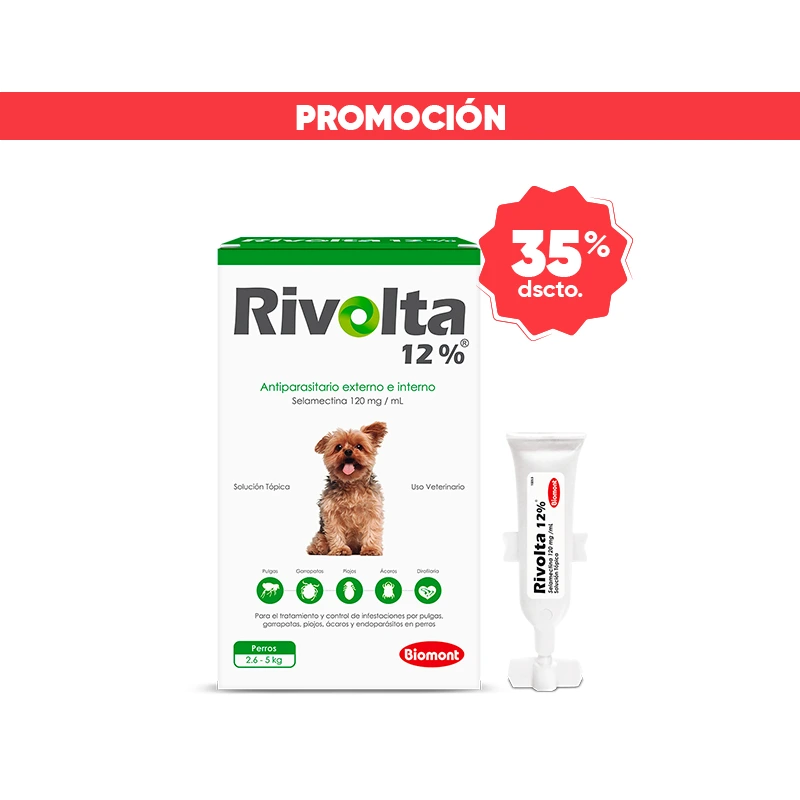 Rivolta 12% es una pipeta antipulgas de 0.25 ml para perros de aplicación mensual. Se considera un antiparasitario interno y externo en solución tópica que puede ser usado en perro de entre 2.6 Kg hasta 5 Kg.