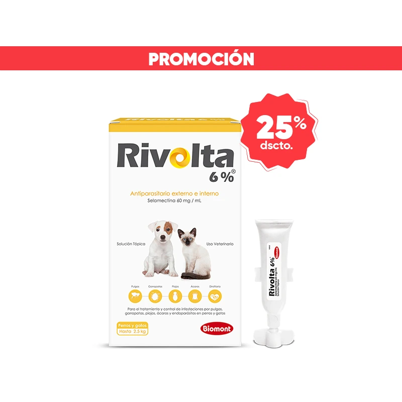 Rivolta 6% es una pipeta antipulgas de 0.25 ml para gatos y perros de aplicación mensual. Se considera un antiparasitario interno y externo en solución tópica que puede ser usado en mascotas de hasta 2,5 Kg.